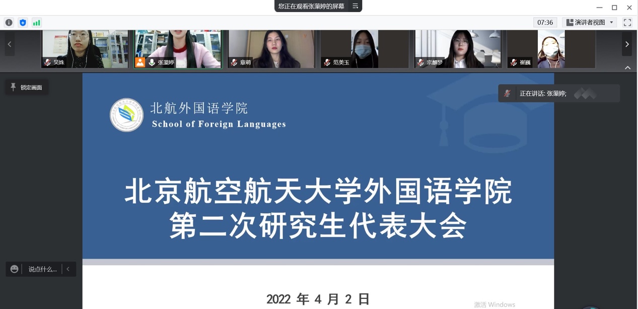 2022年4月2日晚,外国语学院第二次研究生代表大会于线上顺利召开,外国语学院党委副书记陈伟东老师、分团委书记刘威老师、研究生团总支书记、2021级硕士生辅导员张蕖婷、校研会代表赵谦及21位研究生代表出席了此次会议。
